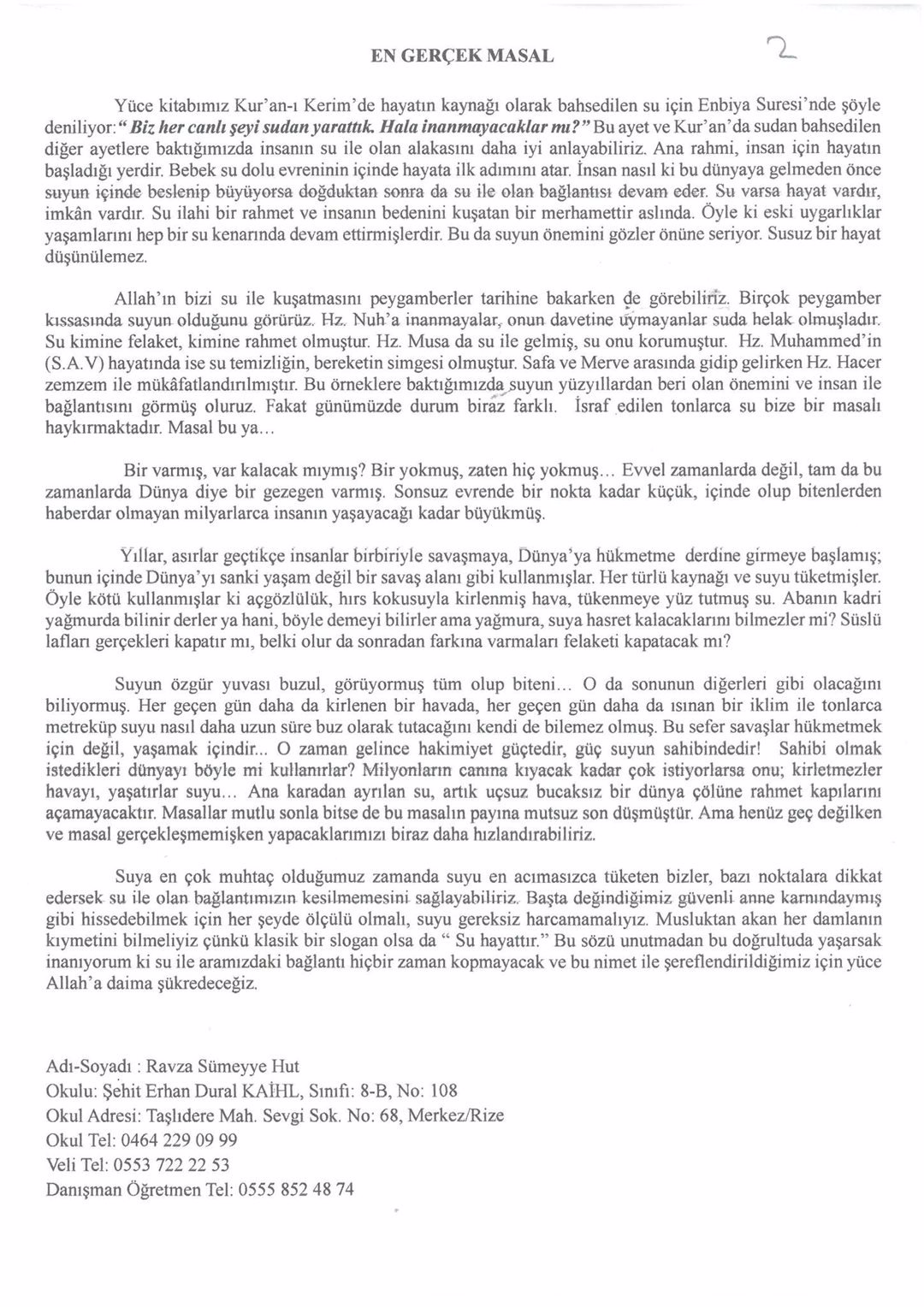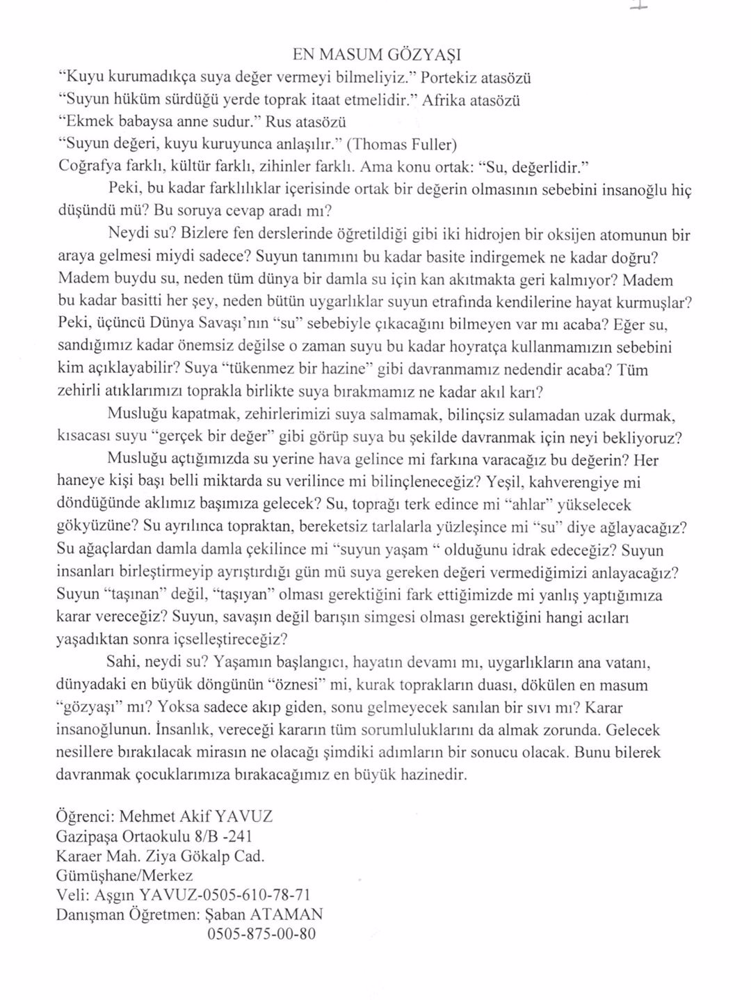 DÜNYA SU GÜNÜ YARIŞMALARINDA BÖLGEMİZDE DERECEYE GİREN ÖĞRENCİLERE ÖDÜLLERİ TAKDİM EDİLDİ